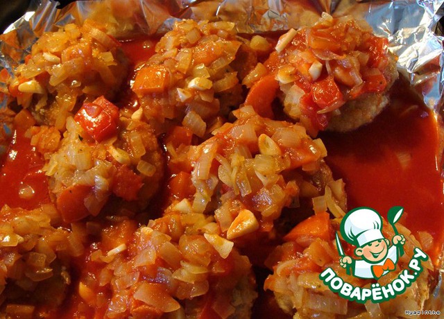 выложить овощи на котлетки, залить все 1 стаканом томатного сока