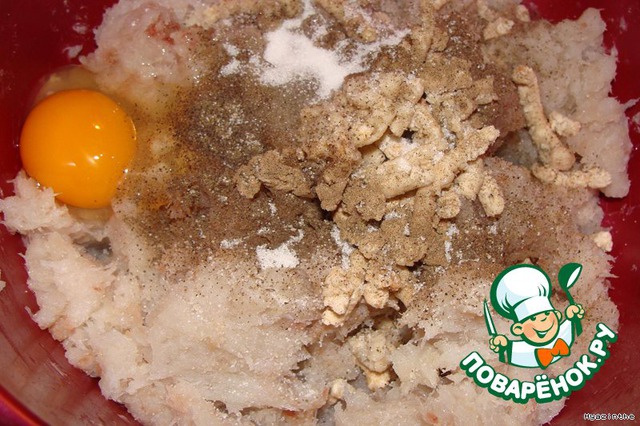 Добавить размоченный хлеб, соль, дать постоять 5-10 минут, потом слить образовавшуюся жидкость. Добавить яйцо, перец, все тщательно смешать.