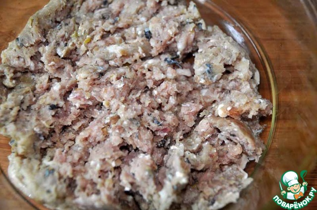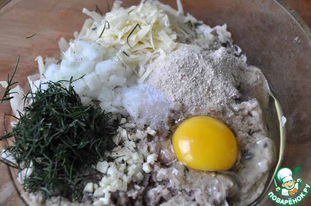 Добавляем в фарш половину головки мелкопорезанного лука, мелкопорезанный чеснок, тёртый пармезан, яйцо, мелкопорезанный укроп (или петрушку), панировочные сухари, соль, свежемолотый чёрный перец.