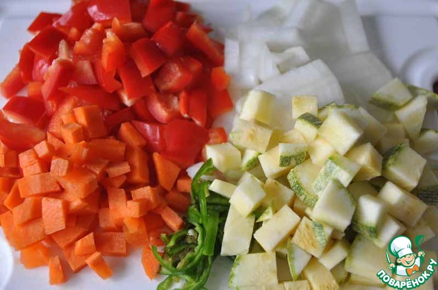 Овощи моем, чистим. Кубиками нарезаем половину головки лука, красный болгарский перец, цуккини, морковь. Мелко режем зелёный перец чили.