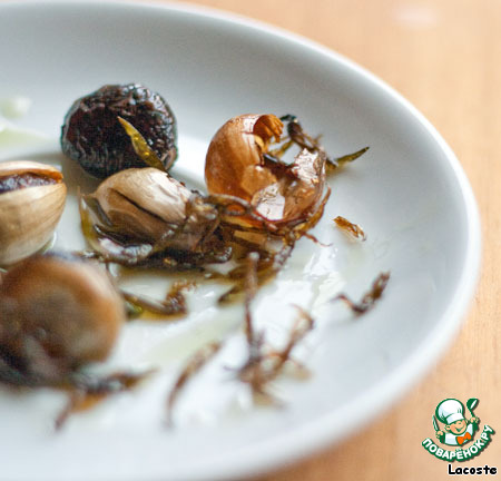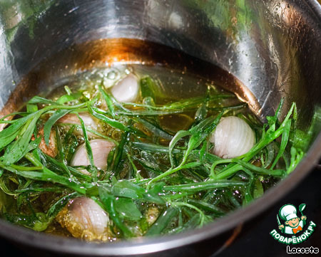 Опустить в разогретое масло веточки тархуна и очищенный чеснок, уменьшить огонь до минимума, и томить на маленьком огне около 15-20 минут (чеснок должен быть мягким). Затем, снять с огня, накрыть крышкой и оставить еще на 15 минут.