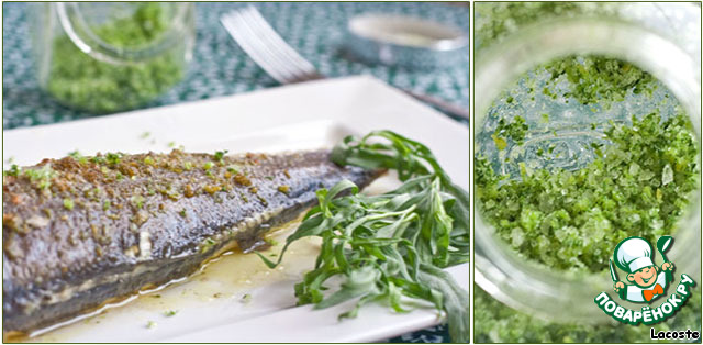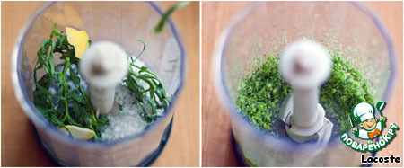 Для этого, измельчить ингредиенты для соли (пару веточек тархуна, цедру лимона, морскую соль) в блендере.