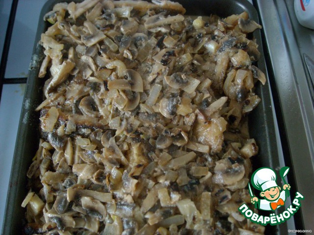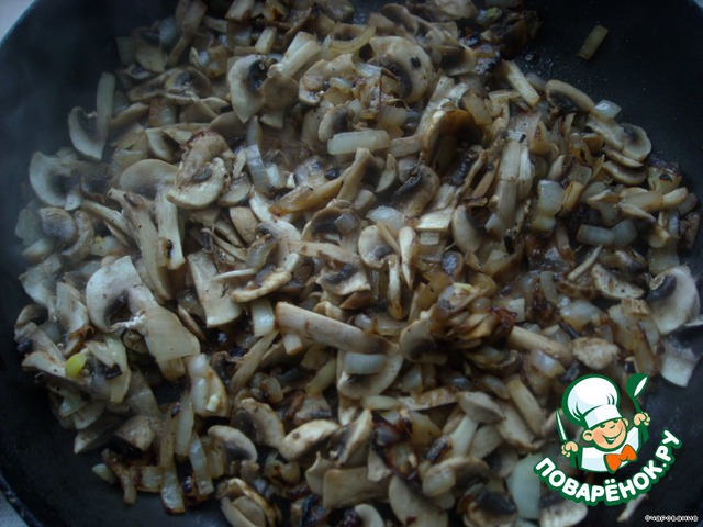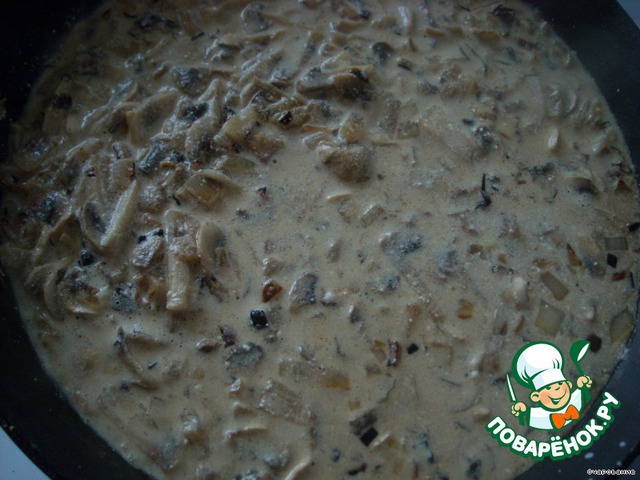 Для соуса: лук и грибы измельчить и обжарить,добавить сметану и потушить, посолить, поперчить.