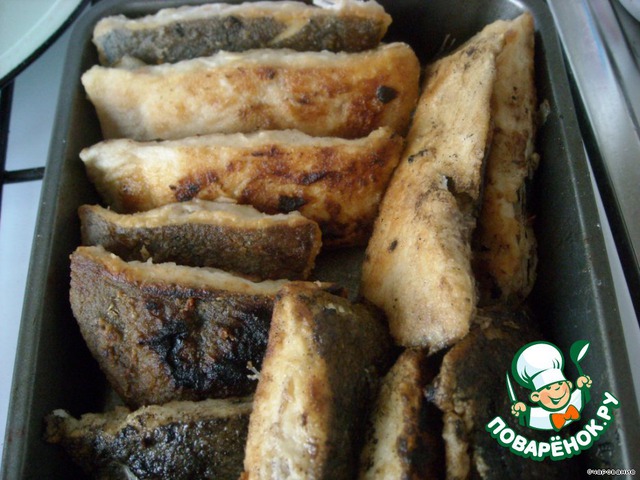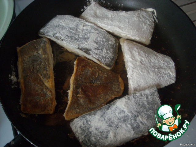 Рыбу обработать, посолить, поперчить, запанировать в муке и обжарить с двух сторн до золотистого цвета.