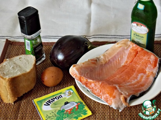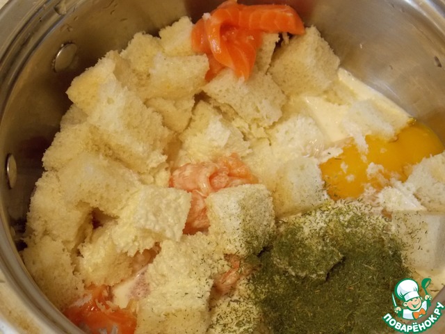 В чашу кладем нарезанный кубиком батон, укроп (или зелень, которая Вам нравится), яйцо, обрезки форели и наливаем сливки. Кладем обжаренный баклажан, посолить, поперчить и все пробиваем блендером до однородной массы.