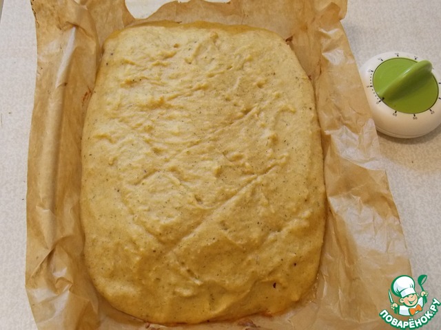 В форму положить пекарскую бумагу и смазать маслом. Положить 1/2 нашего теста прямоугольником чуть больше куска форели, которую кладем на него.