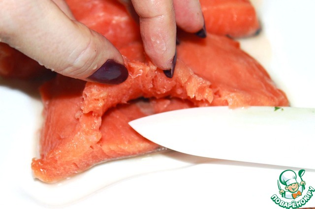 В стейках лосося делаем прорези но не сквозные. Нам нужны кармашки