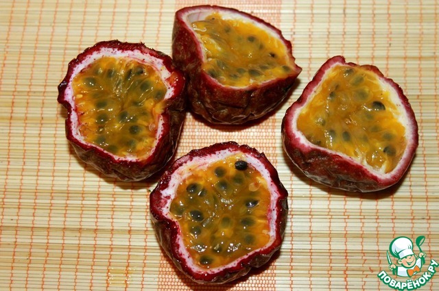 Маракуйю разрезать пополам. (Кстати, на этом этапе не обязательно использовать столь экзотический фрукт. Прекрасно подойдет виноград, порезанный колечками, мандарины или апельсины. Я делала со всеми этими фруктами, поверьте, было очень вкусно, но сегодня у меня именно маракуйя)
