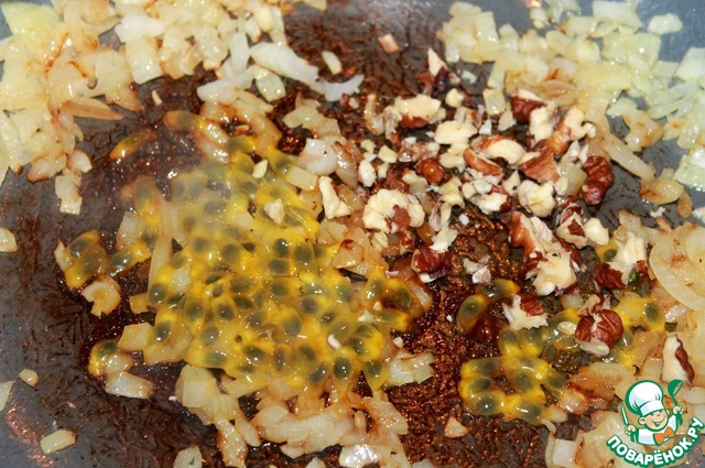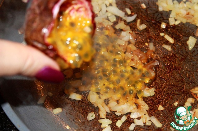 Итак, к луку добавляю содержимое маракуйи. Косточки будут приятно похрустывать, а мякоть придаст свежести и кислинки соусу.
