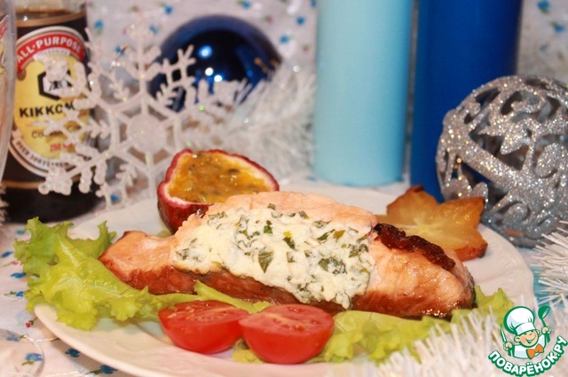 Накрываем стол, на листик салата укладываем наш фаршированный лосось, полить соусом, в котором тушились лососевые кармашки, рядом укладываем половинку маракуйи, если она была использована в приготовлении соуса, либо виноград, либо дольки мандарина, либо дольки апельсина. Я еще украсила карамболой. Ведь у нас праздник!!!
