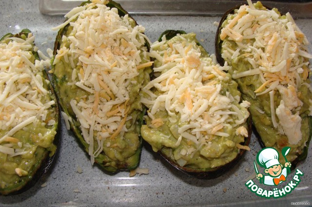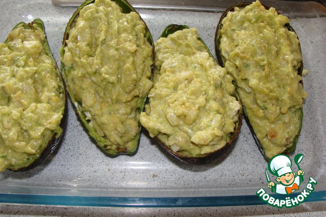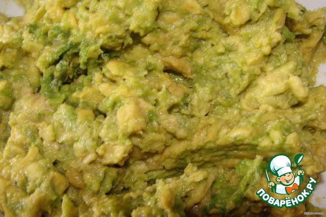 Авокадо разрезать, полить лимонным соком, чтобы не потемнели, удалить мякоть с косточкой
