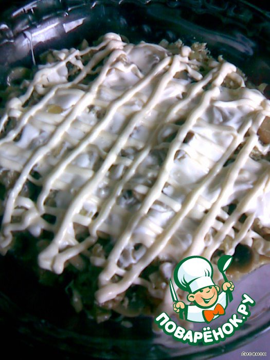 Сверху полить сметаной и майонезом и отправить в духовку, разогретую до 170 градусов на 15-20 минут.