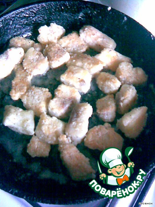 Филе рыбы режем кусочками, обваливаем в муке (соль, перец)