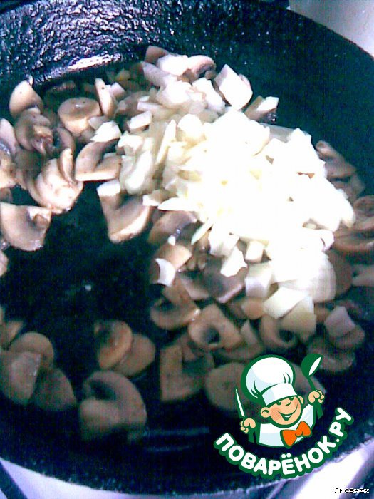 Добавить масло и измельченный лук. Обжарить лук до прозрачности и добавить к нему измельченные грибы (у меня были шампиньоны пластинками).
