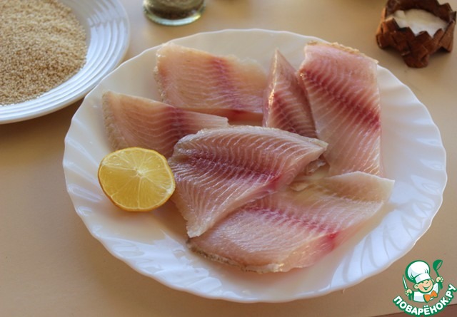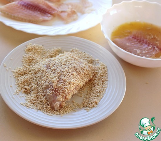 Кусочки филе обмакнуть в яйцо, обвалять в кунжуте.
