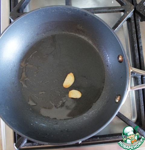 Если сковорода с хорошим покрытием, то для обжарки понадобится минимум растительного масла. Сковороду с маслом разогреть и обжарить пару зубчиков чеснока, масло ароматизируется, чеснок убрать.