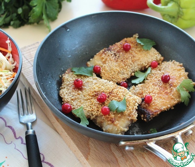 | На календаре четверг, по старой советской традиции этот день считался рыбным. Не буду нарушать эту добрую традицию и хочу предложить вам рецепт рыбного филе в кунжуте. Нежное мясо рыбы, хрустящие семечки кунжута и как дополнение, сочные ягоды красной смородины или брусники, всё это вместе создает удивительное послевкусие. |