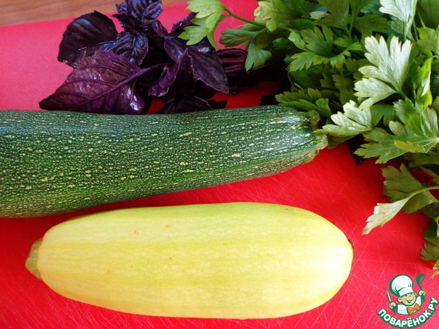 Пока готовится скумбрия, мы займёмся салатом. Нам понадобятся вот такие симпатичные молодые кабачки, зелень. В идеале - базилик, мята, петрушка, тимьян. И перец чили очень желательно свежий.