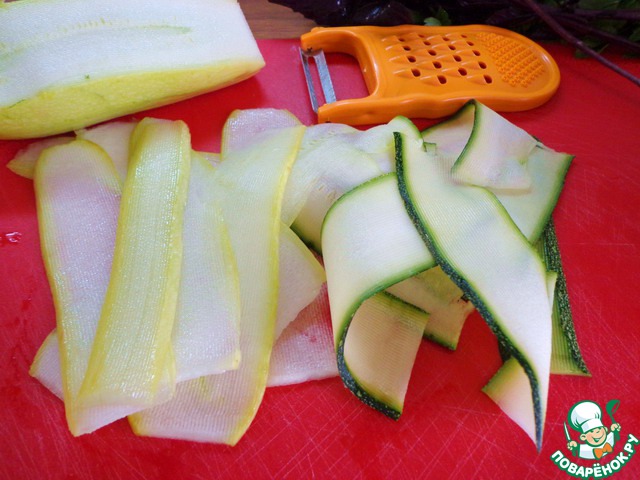 Кабачки нарезать тонкими полосками, сложить в миску.
