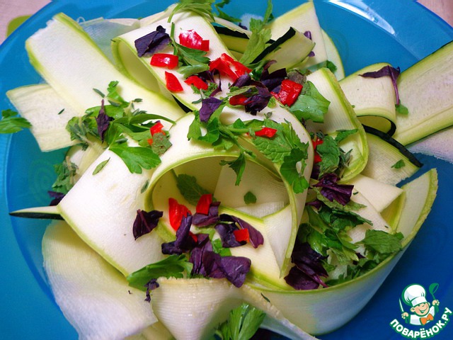| Увидела это блюдо в одной из передач с Джейми Оливером. Кто хоть раз видел этого повара на экране, знает, как он заражает своим энтузиазмом) Меня в первую очередь очаровал салат из сырых кабачков. И когда я его приготовила, просто влюбилась в этот салат и блюдо в целом! С одной стороны всё очень просто и быстро, а с другой - такая гармония вкусов! Готовила уже не раз, даже фотографировала... но меня уже замучила совесть, что я до сих пор не поделилась с вами рецептом этого блюда! Простите, исправляюсь))) |