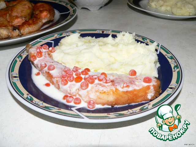 Уложите рыбку на тарелку и полейте сверху соусом. На гарнир у меня было картофельное пюре. Наслаждайтесь!!!