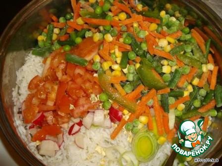 В рис всыпать порезанные кусочками помидор, редис, порезанный кружочками лук порей, овощную смесь. Перемешать. Полить оливковым маслом. Добавить немножко воды.