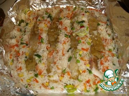На противне из фольги соорудить конверт. Выложить в него рис «полосками» чередуя с рыбой. Завернуть тщательно фольгой, чтобы не было щелей.