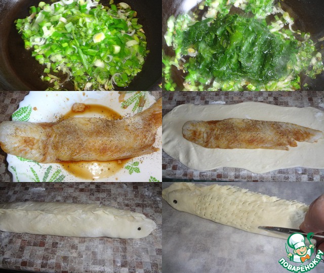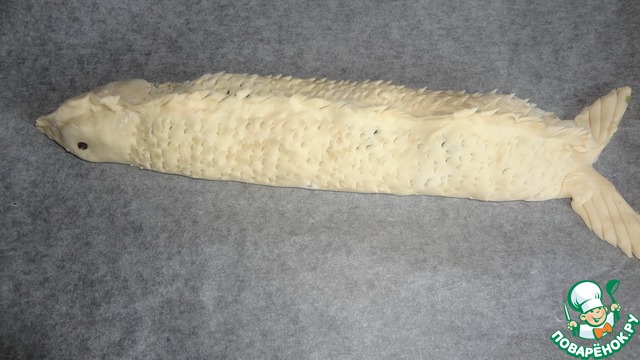 Сверху на рыбу положить тушёный шпинат с луком. Закрыть тестом рыбу с двух сторон, как у меня на фотографии, плотно прижав с двух сторон. С одной стороны нужно придать форму головы рыбке, вставив два глазка из чёрного перца. А с противоположной стороны немного разрезать на конце и сделать хвост. Ножом немного нажмите на хвост, чтобы получился нужный рисунок. Возьмите маленькие острые ножницы и надрежьте вдоль спинки большой плавник. Сделайте ножницами чешую, заодно будут отверстия, через которые будет выходить пар.