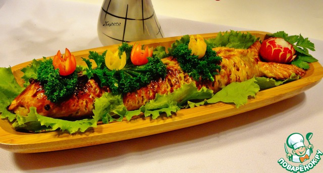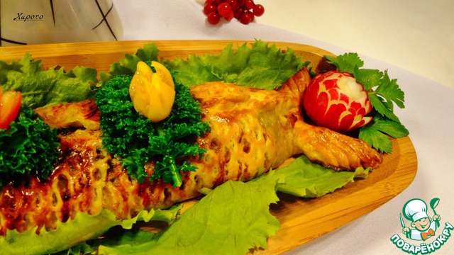 Положить рыбку на бумагу для выпекания и поставить в разогретую до 180град. С духовку на 25-30 мин. Пока не зарумянится.