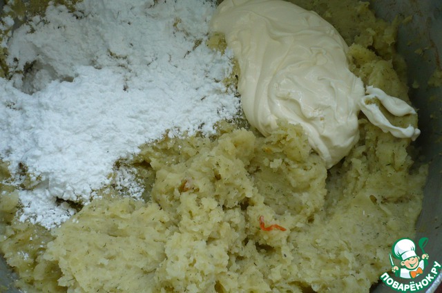 Картошку сварить, помять. Остудить. Добавить 1 ст. л. масла, крахмал, укроп и 1 ст. л. майонеза. Хорошо перемешать. Масса будет похожа немного на тесто.