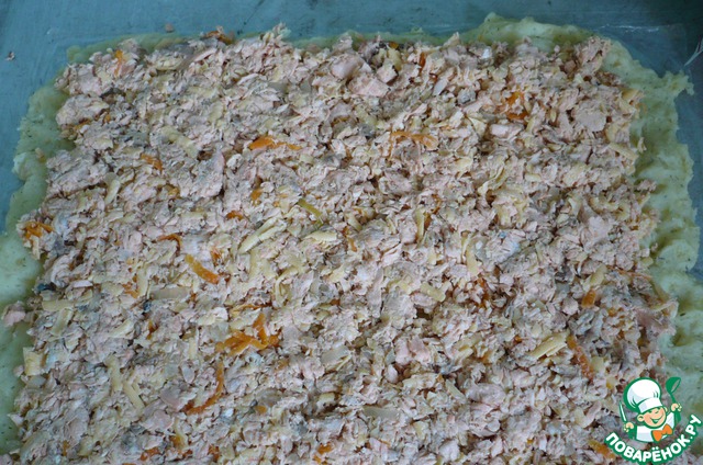 Рыбу отварить, остудить и размять руками на небольшие кусочки. Одновременно убирая пропущенные косточки. Добавить пережарку и тертый сыр. Все перемешать.