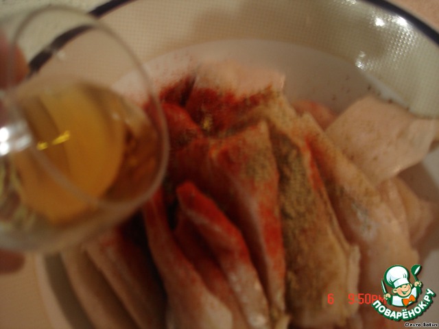 Замариновать рыбу в специях, красном перце, добавить коньяк.