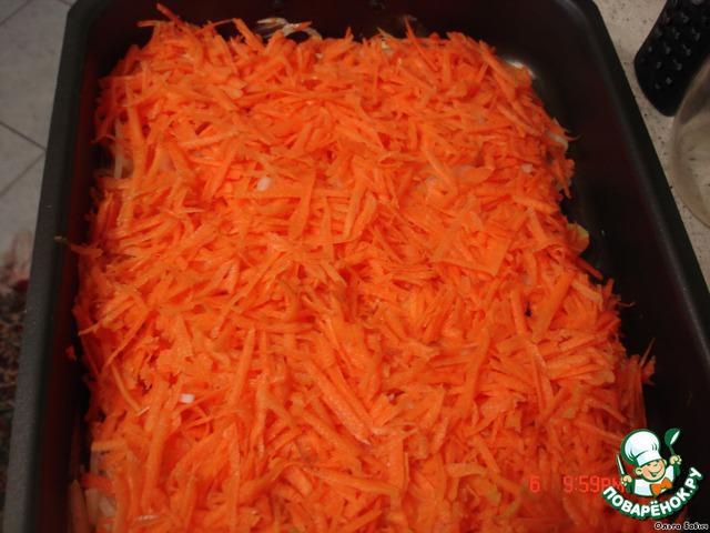Hа него лук, порезанный кольцами, морковь, потертую на терке, немного присолить.
