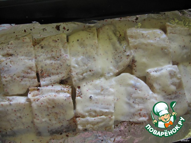 Рыбку порезать на порционные кусочки, посолить, поперчить, сложить в емкость.
