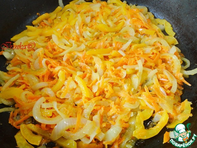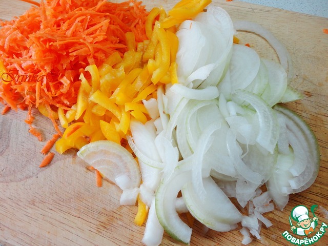 Сначала кладем морковь, потом лук, следом - сладкий перец.