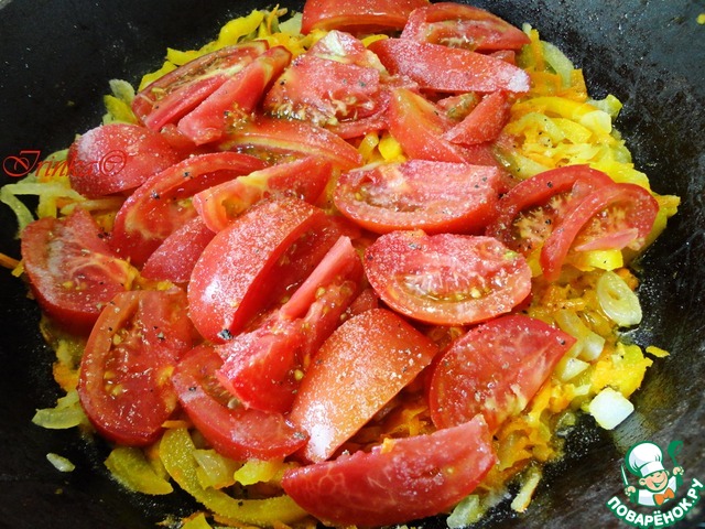 Когда овощи станут прозрачными (не зажарьте!), кладем к ним помидоры, солим, перчим, накрываем крышкой и слегка тушим.
