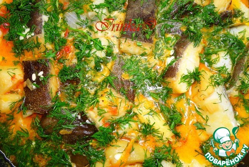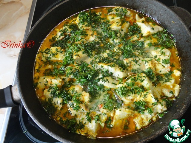 Накрываем крышкой и припускаем на слабом огне 15 минут. Соус должен только чуть булькать, иначе рыба у вас развалится.