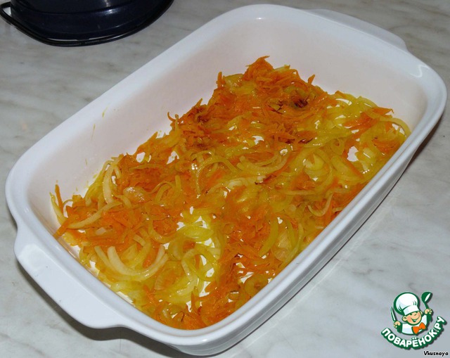 Морковь натереть на терке, лук порезать полукольцами. Немного обжарить. Выложить в смазанную оливковым маслом форму для запекания.