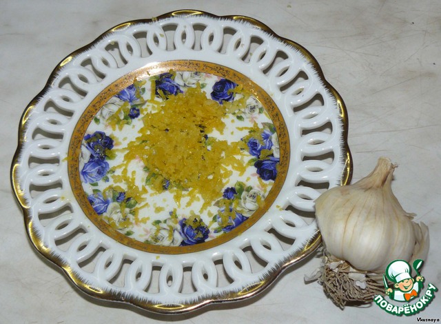 На мелкой терке натереть цедру лимона. Выдавить чеснок. Добавить оливковое масло.