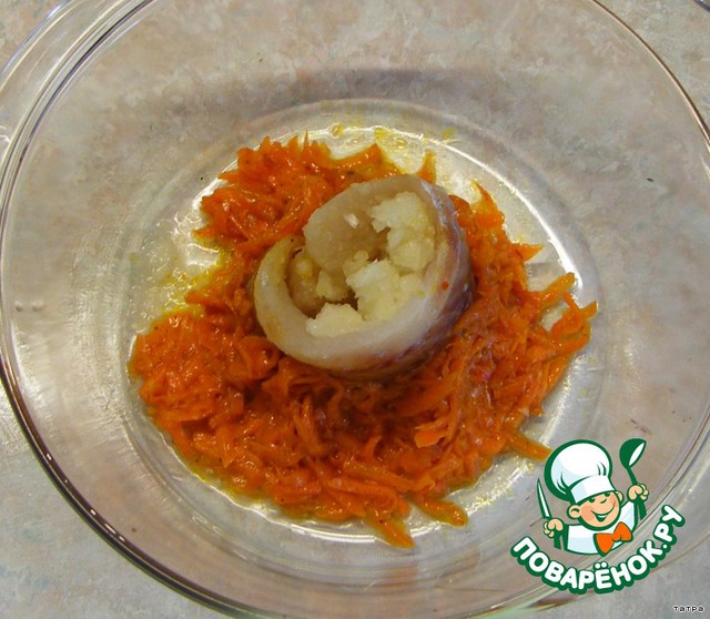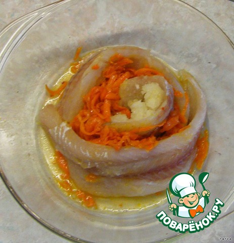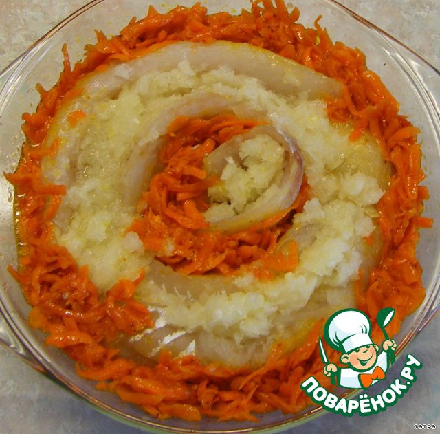 Укладываем рыбу в жарочную форму.Первый кусочек сворачиваем рулетом,в качестве начинки используем лук.Обкладываем морковью.