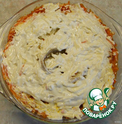 Для начинки:морковь трем на терке,слегка обжариваем с добавлением кетчупа,солим,перчим.