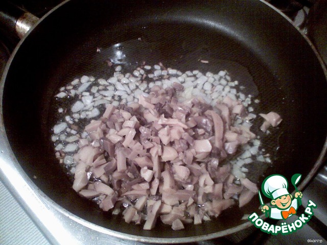 Грибы нарезать и добавить к луку. Обжарить до готовности. Мне вкуснее, когда грибы нарезаны крупно и их много. Но можете варьировать, как вам нравится.