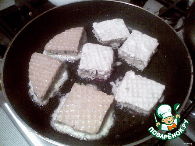 Нарезать на кусочки, как вам угодно. У меня приблизительно 5x5 см. Обмакнуть в готовую смесь: