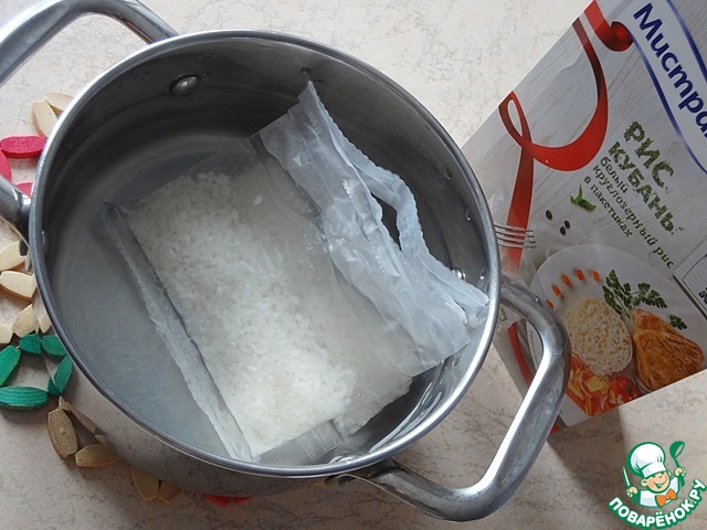 В закипевшую воду опускаем пакетики с рисом. Для этого рецепта я взяла рис Янтарь в варочных пакетиках от ТМ Мистраль. Такой способ приготовления риса очень удобен и прост: не нужно высчитывать соотношение вода/рис, да и рис всегда получается рассыпчатым и неразваренным. На три порции я использую два пакетика. Рис Янтарь варится 25 минут: этого с лихвой хватит на завершение приготовления рыбы. Не забудьте поставить духовку на разогрев (190-200° С)