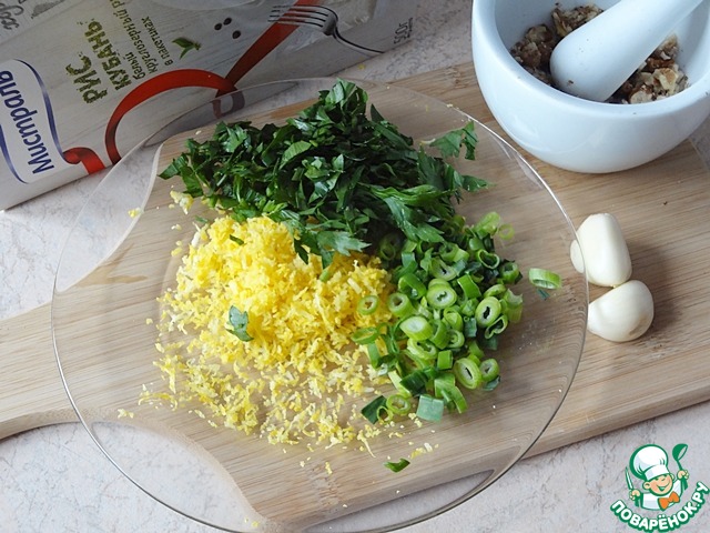 Для заправки натрите цедру лимона, нарежьте зелёный лук и и петрушку, потолките грецкие орехи, измельчите чеснок с помощью пресса.
