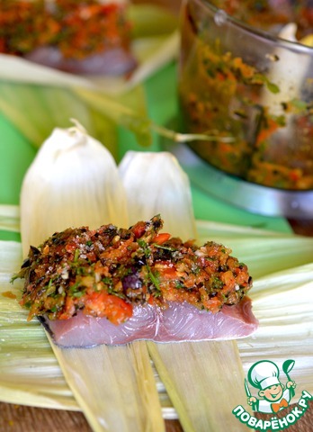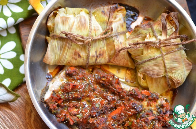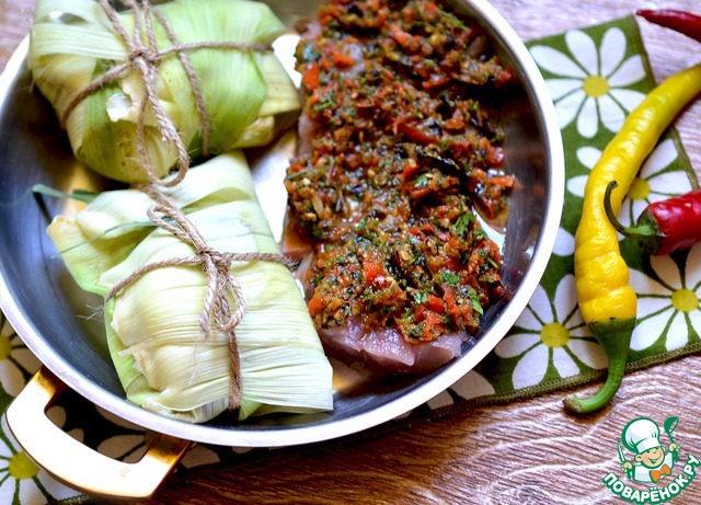 | Хочу познакомить вас с рецептом африканской кухни, потрясающим и самобытным. Африканцы часто используют банановые листья для приготовления стью, запекания, они даже обжаривают заложенную в них рыбу. Пальмовых листьев у нас не найти, зато есть кукурузные - прекрасная альтернатива! Подайте такую рыбу на праздничный стол, что-бы каждый из гостей сам разрезал нить и открыл конверт. Поверьте, этот маленький ритуал придаст загадочности и антуражу вашему столу. Гости будут в восторге! Ваша задача потом, только принимать похвалы. Я с удовольствием представляю этот рецепт в рамках проекта "Поединки + К". |