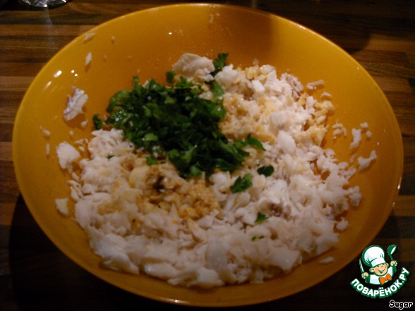 Когда рыба готова, измельчить ее вилкой, добавить оливковое масло, выдавить чеснок, посолить, добавить паприку, тмин, измельченную петрушку, выжать сок из лимона.
