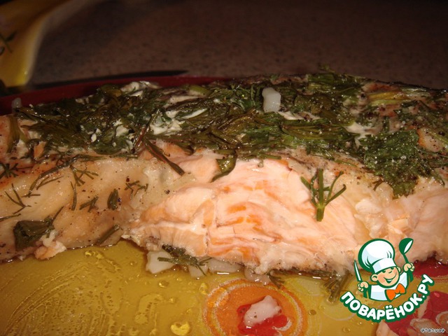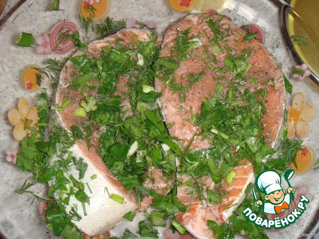 Куски сёмги посолить, поперчить, выжать сок одного лимона, добавить порубленную петрушку и укроп!!!