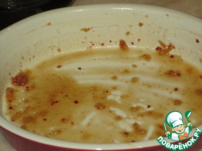 В медово-соевую смесь выдавить чеснок через пресс, добавить красный и черный перец, перемешать