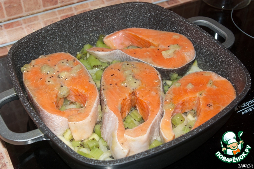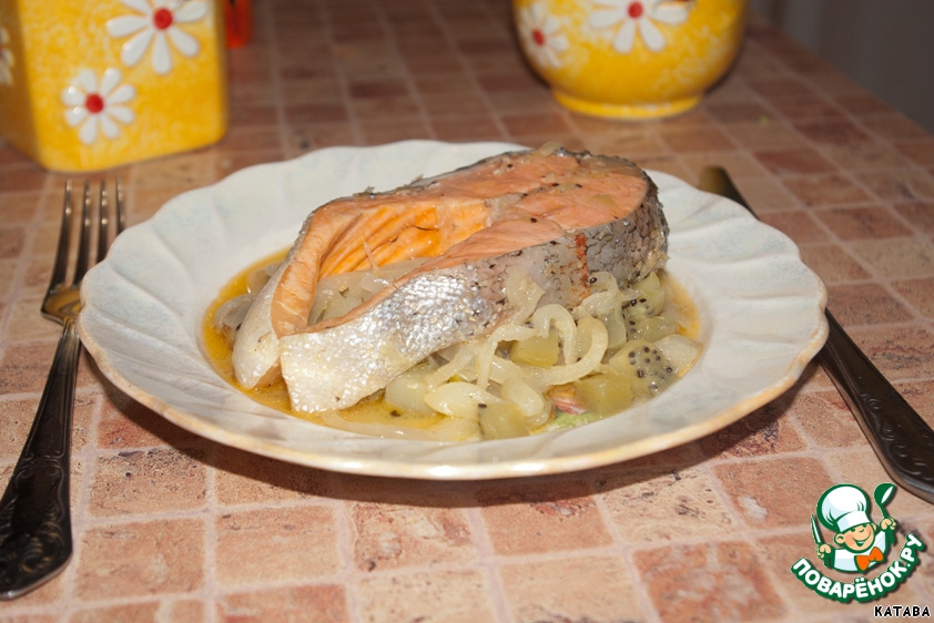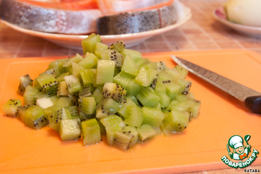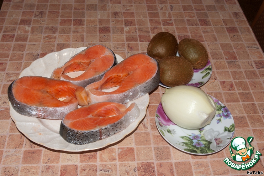 Рыбку вы можете взять любую - лосось, кету, кижуч. Но я бы порекомендовала все-таки форель или семгу. Вот такие стейки. Пару-тройку киви и лук. Лука возьмите 2-3. У меня оказалась последняя луковица, получилось мало вкуснятины(